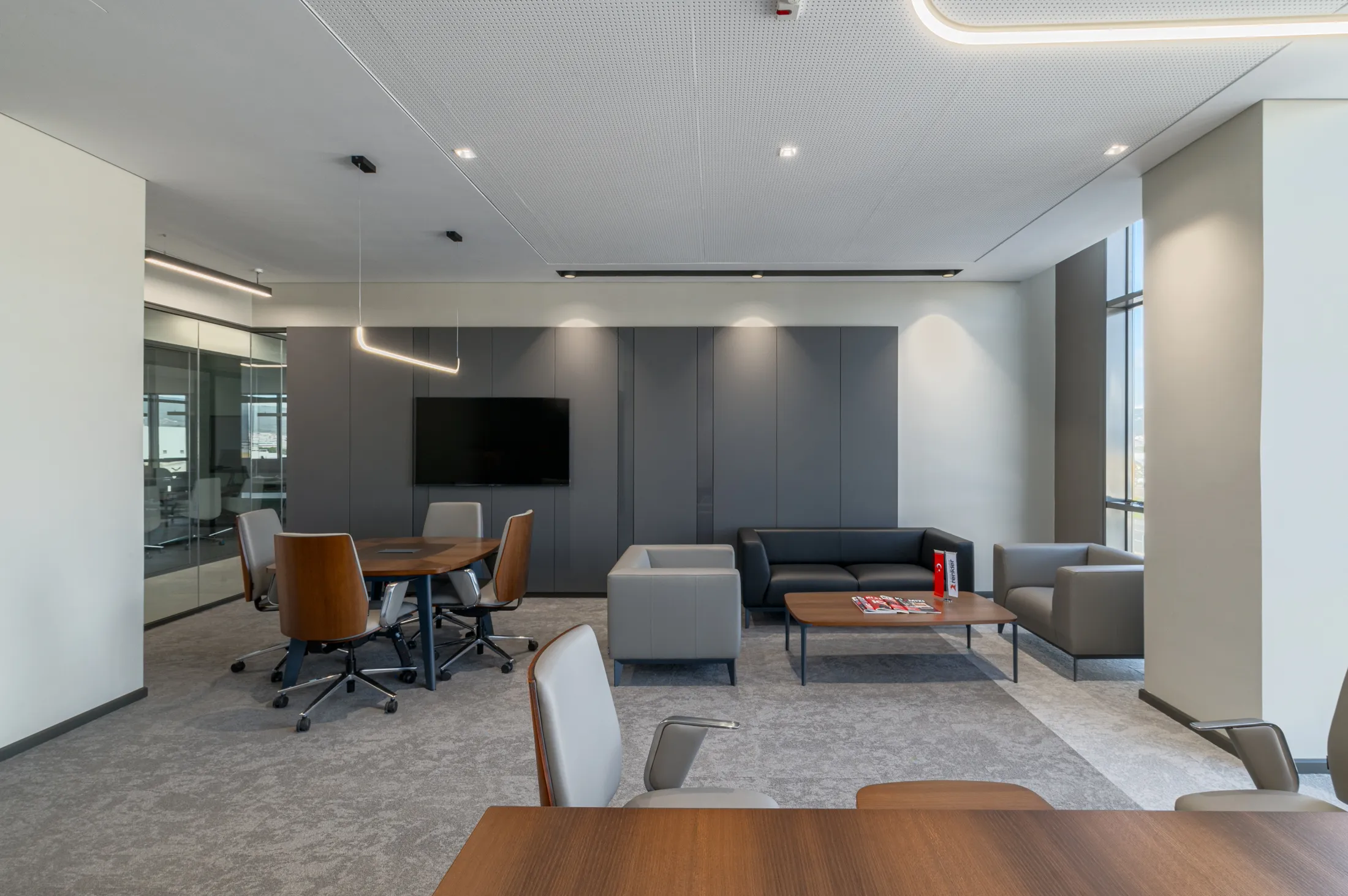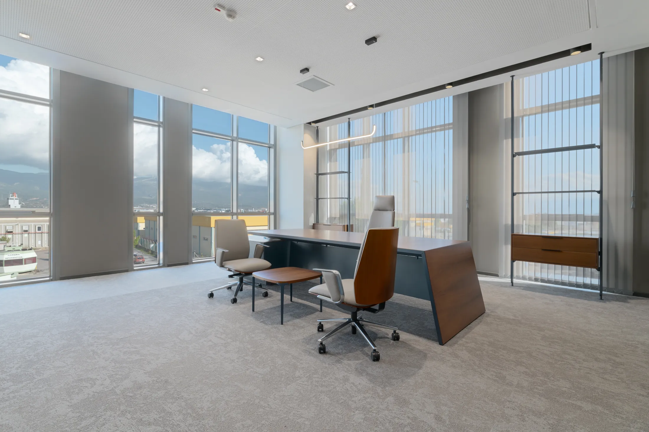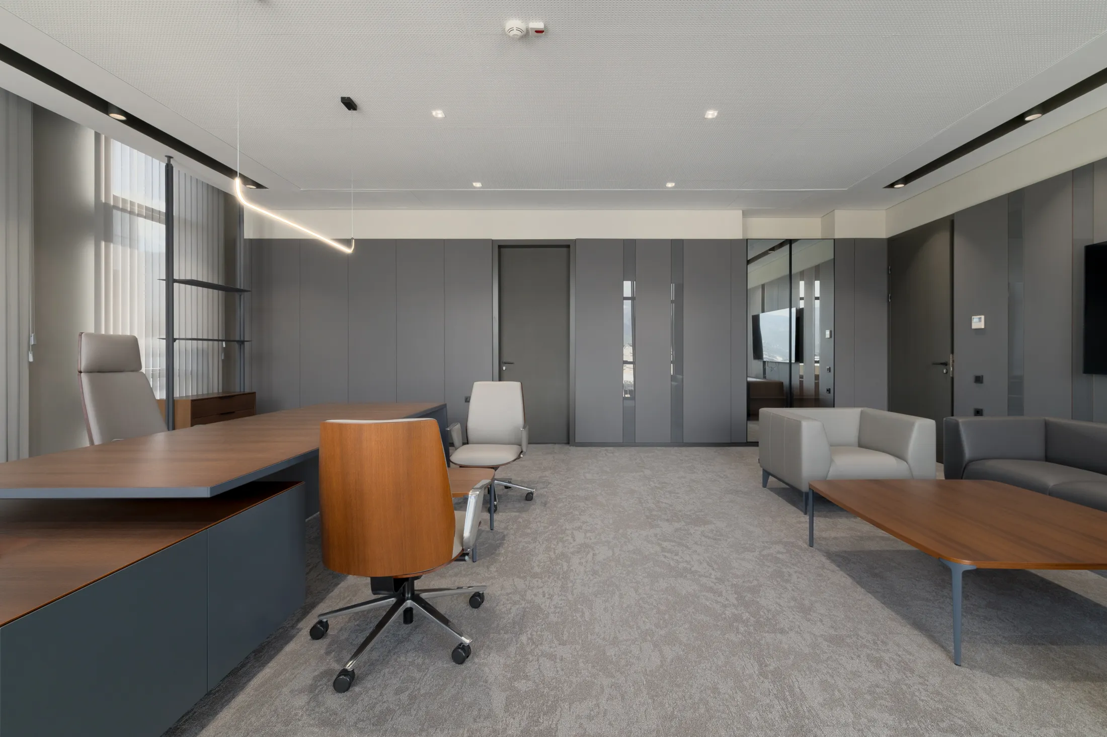 Habitat Design Team imzası taşıyan projede, sabit ve hareketli mobilyalar Yenkur tarafından çözümlendi. Genel müdür ve yönetici ofislerindeki duvar kaplamalarından, yemekhanedeki bordo detaylara; kitchenette alanlarından koridor ve bekleme alanlarına kadar tüm sabit mobilyalar Yenkur imzası taşıyor. Hareketli mobilyalarda ise İtalyan tasarımı ofis ürün grubumuzu, hem operasyonel hem de yönetici ofislerinde kullanmış bulunmaktayız. Her detayda, işlevsellik, estetik ve kurumsal kimlik dengesi gözetildi.