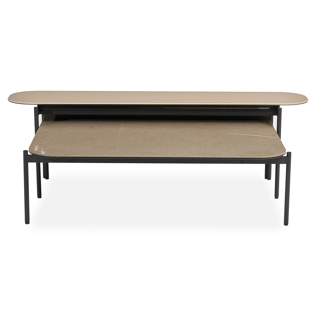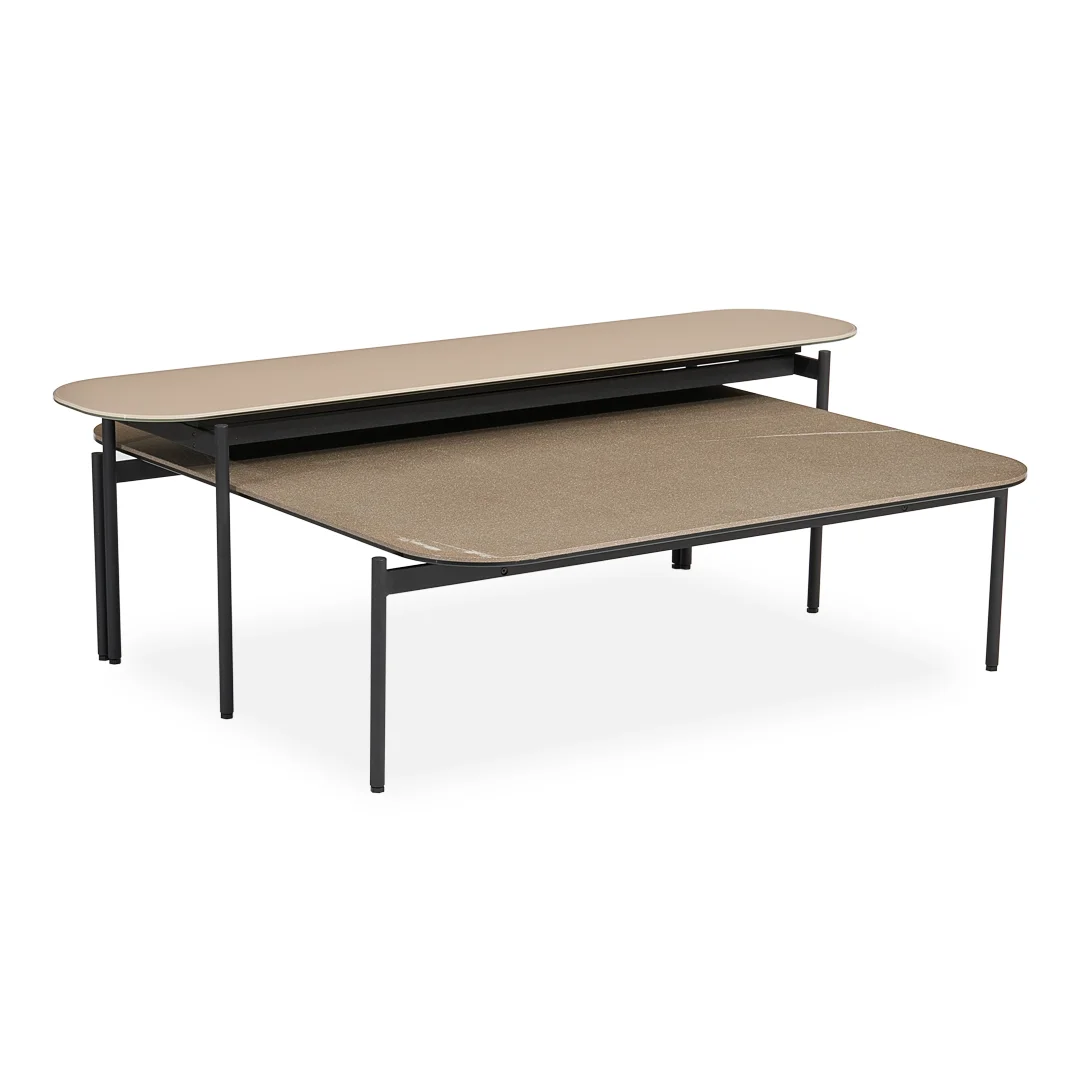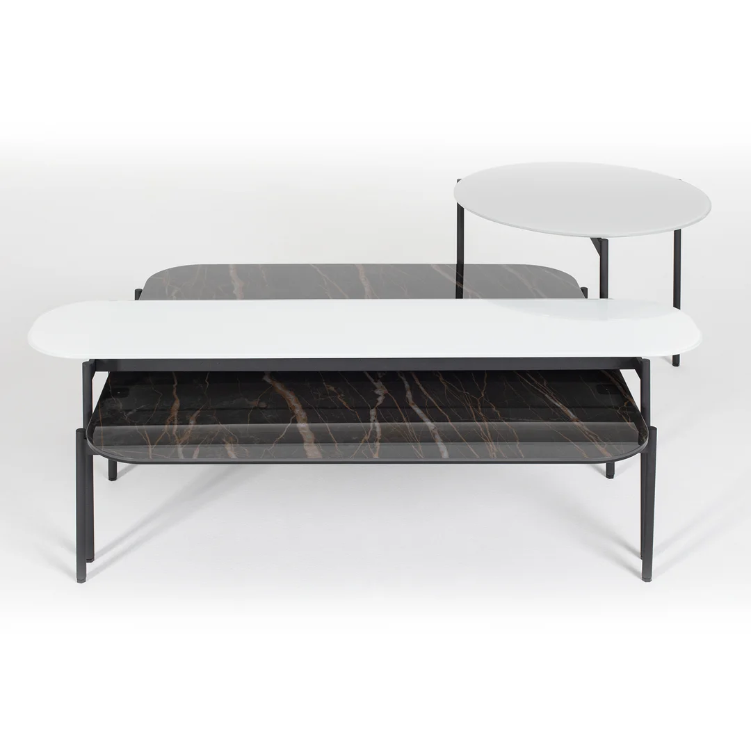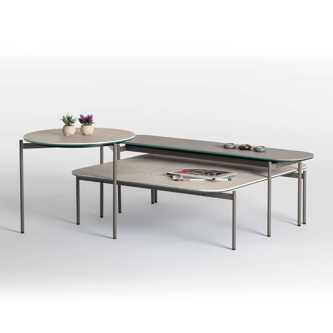 Seramik yüzeye sahip olan Clea sehpa takımı, farklı renk metal, seramik, parlak ve mat cam seçenekleri ile kişiselleştirilebilir.
