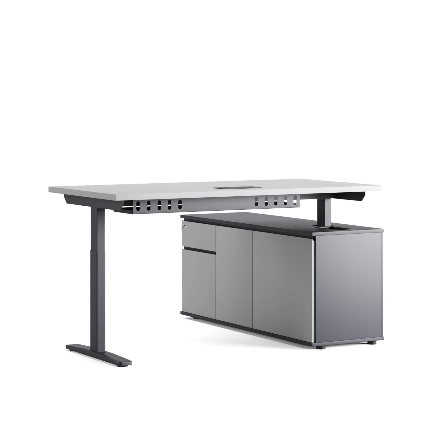 Laminat veya melamin malzemeden oluşan masa tablası ve 72 cm’den 120 cm’e kadar yükselebilen metal ayaklarıyla Fuji, operasyonel kullanımlar için tekil masa versiyonunun yanı sıra tek ayağı sabit etajerli versiyonuyla ara yönetici kullanımları için işlevsel ve pratik çözümler sunuyor.