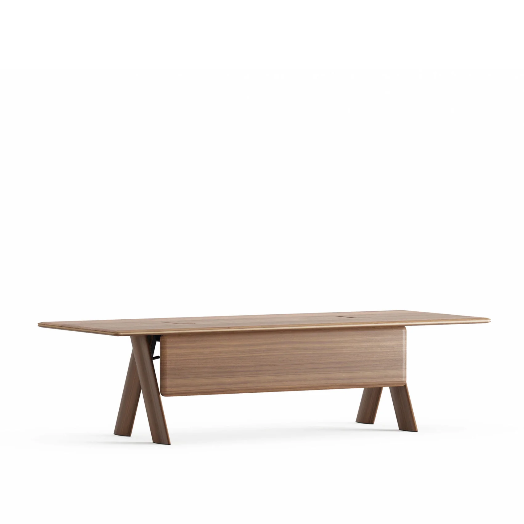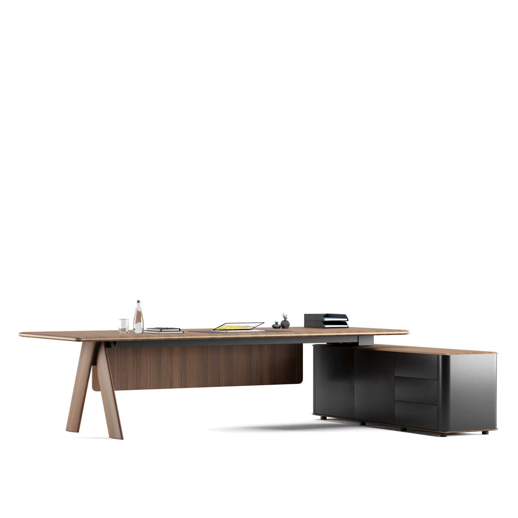 İki ahşap panel arasında doğal ahşap kaplama şerit detayı ve özel birleşim tekniğiyle birbirine sabitlenen A formuna sahip ayak tasarımıyla sıra dışı bir görünüm sunan Meliades yönetici masası, ayağın bu formu sayesinde kullanıcısına geniş bir hareket alanı sağlıyor. Tek tarafı etajer eklentili olarak sunulan masaya eklenen ön panel masanın şık görünümünü desteklerken kullanım konforunu artıyor. Meliades serisine özel olarak tabla ve keson yüzeyi için deri kaplama alternatifi de sunulmakta.