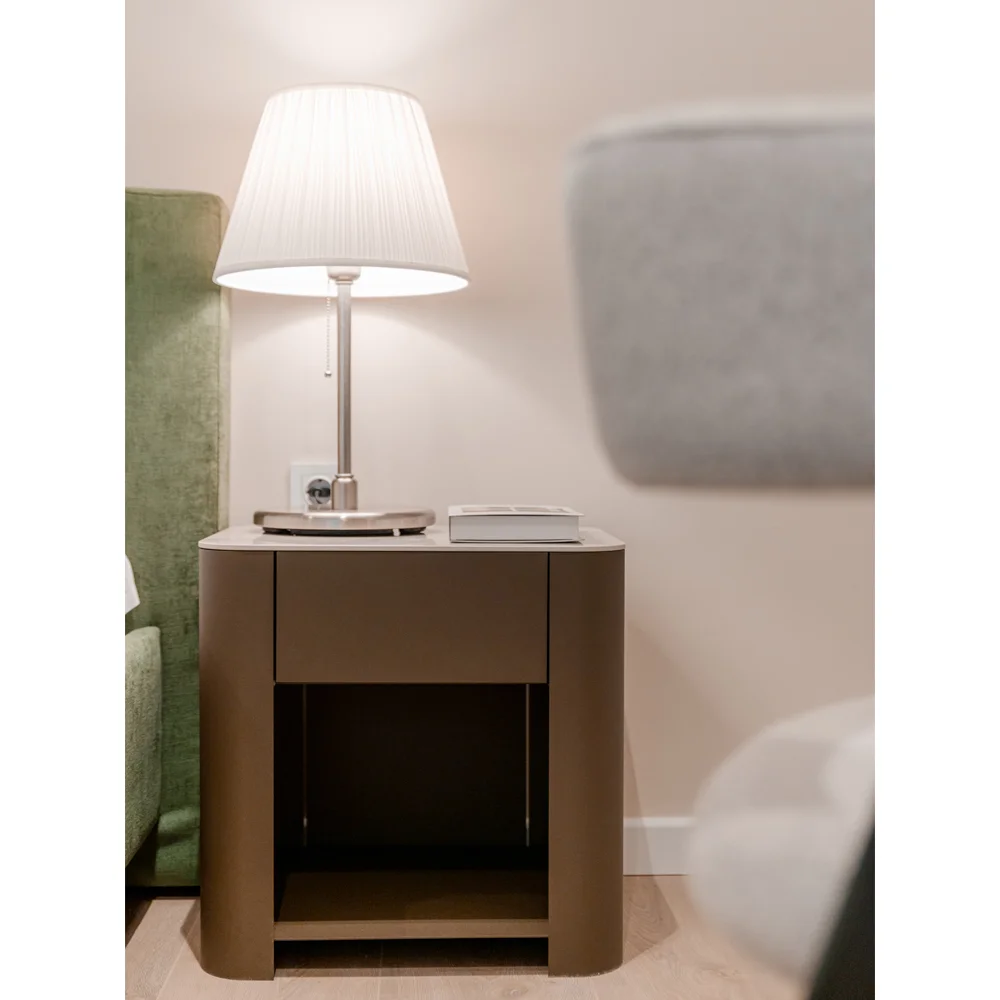 Metal kapaklara ve seramik yüzeye sahip olan Round komodin, seramik üst yüzeye sahiptir ve farklı seramik, parlak ve mat cam seçenekleri ile kişiselleştirilebilir.